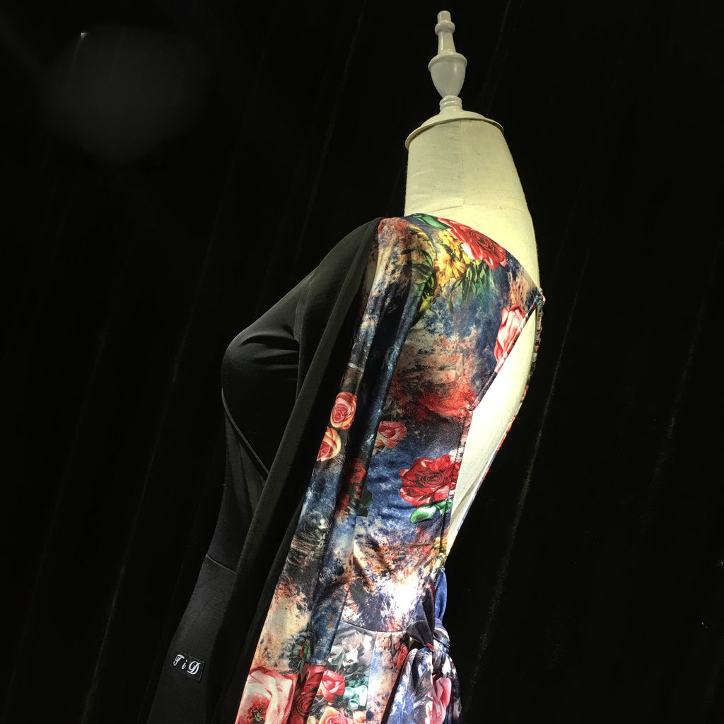 ゴージャスな柄ですが、前面はオールブラックで、背面にのみプリント生地を使用しているため、案外上品に仕上がっております。