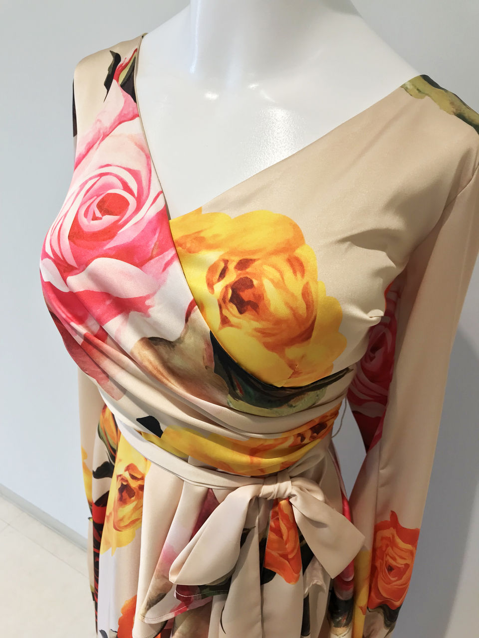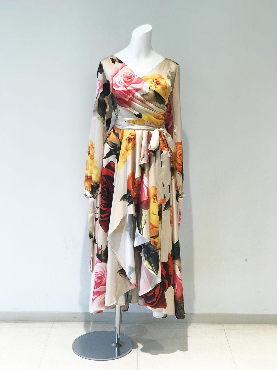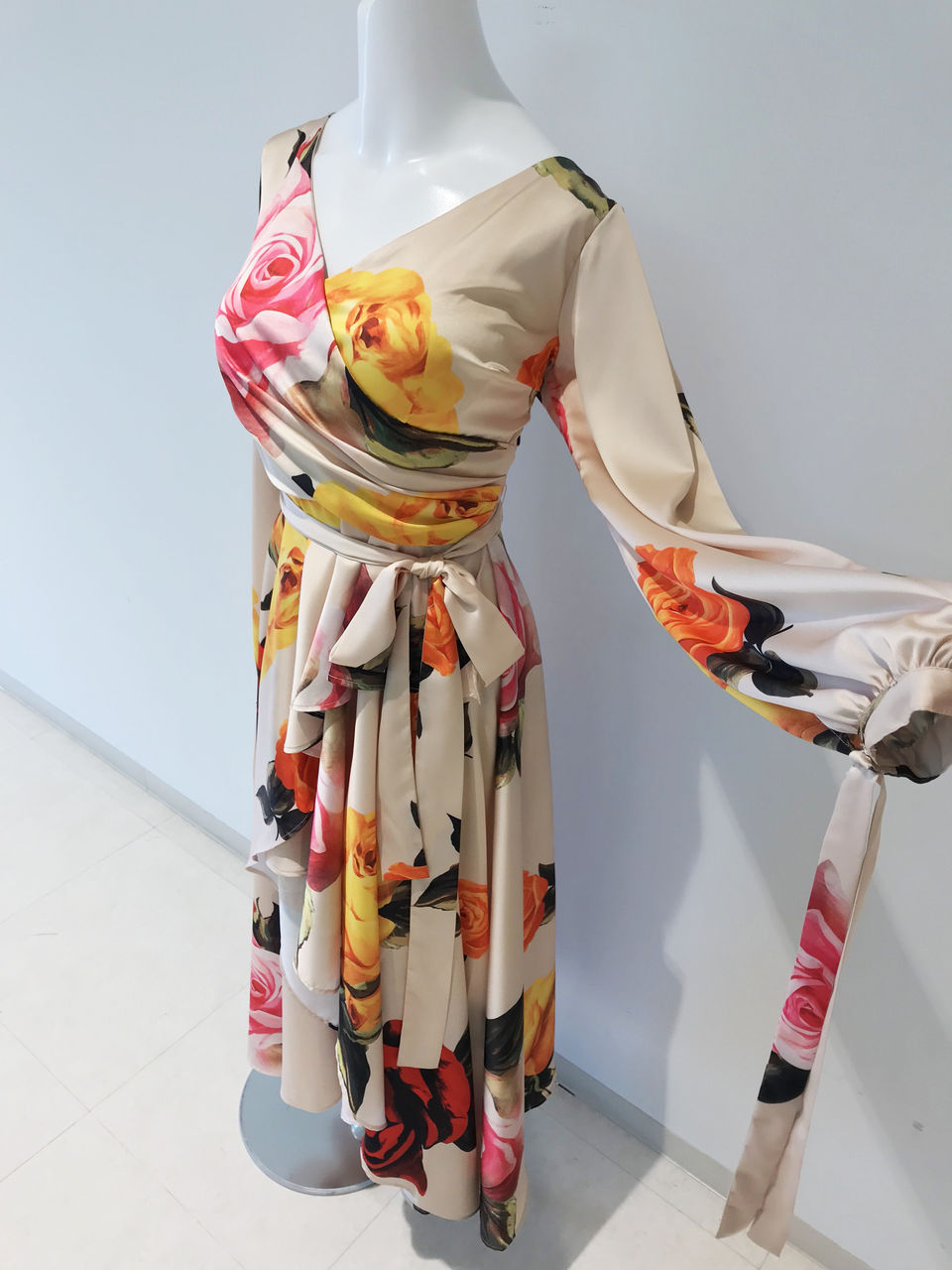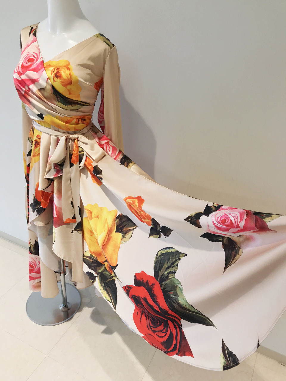 上品なクリームベージュの布地に大きな花柄がたくさんプリントされている、とてもゴージャスなワンピースです。