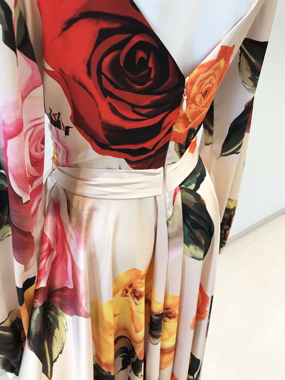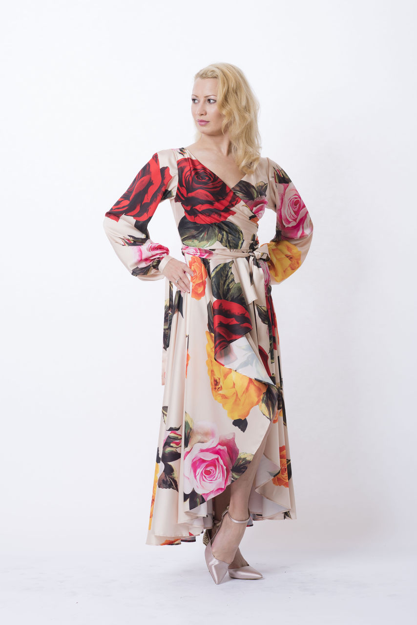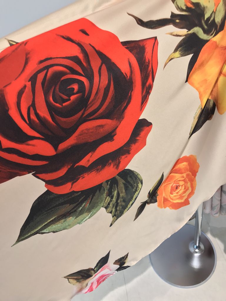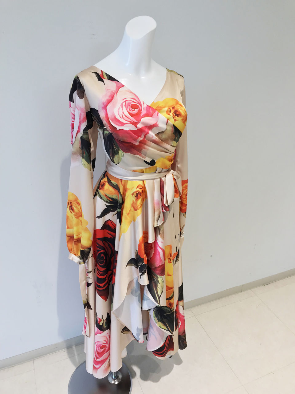 上品なクリームベージュの布地に大きな花柄がたくさんプリントされている、とてもゴージャスなワンピースです。