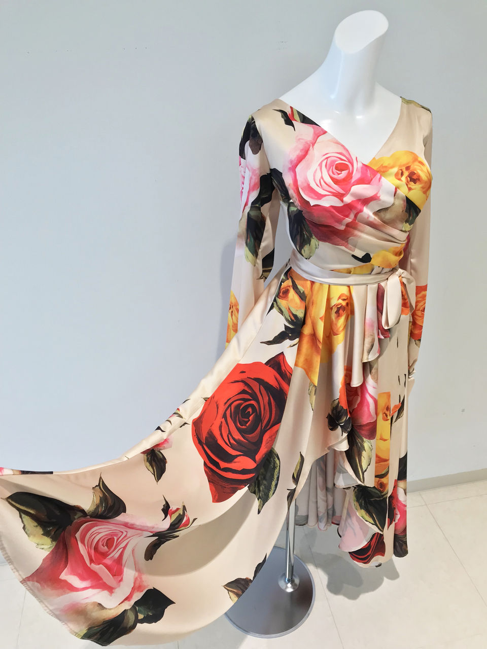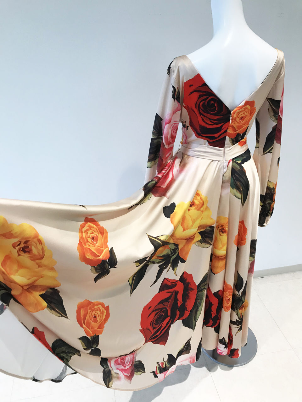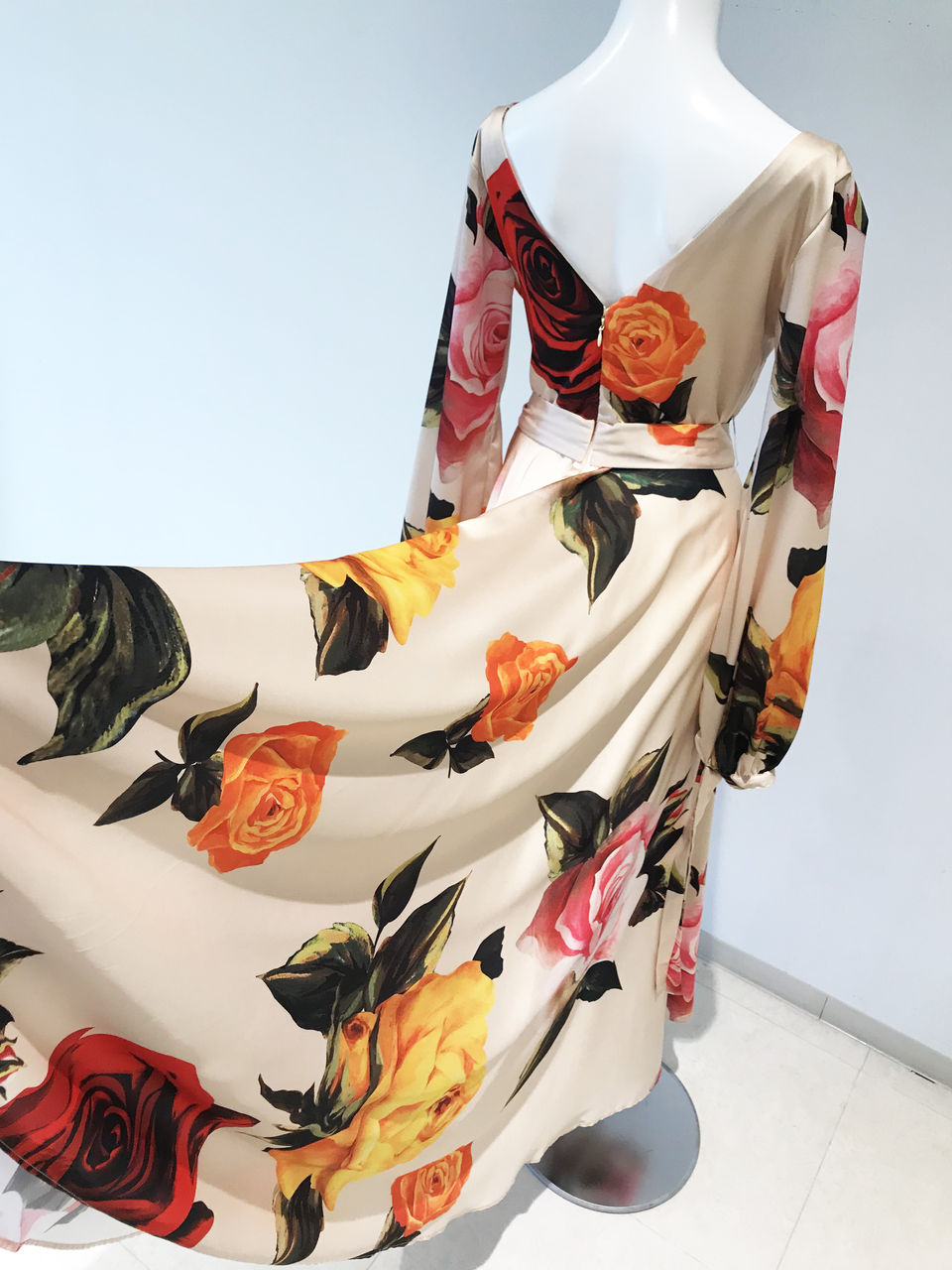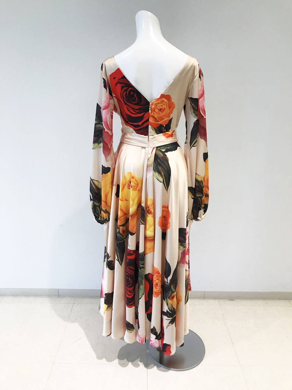 上品なクリームベージュの布地に大きな花柄がたくさんプリントされている、とてもゴージャスなワンピースです。